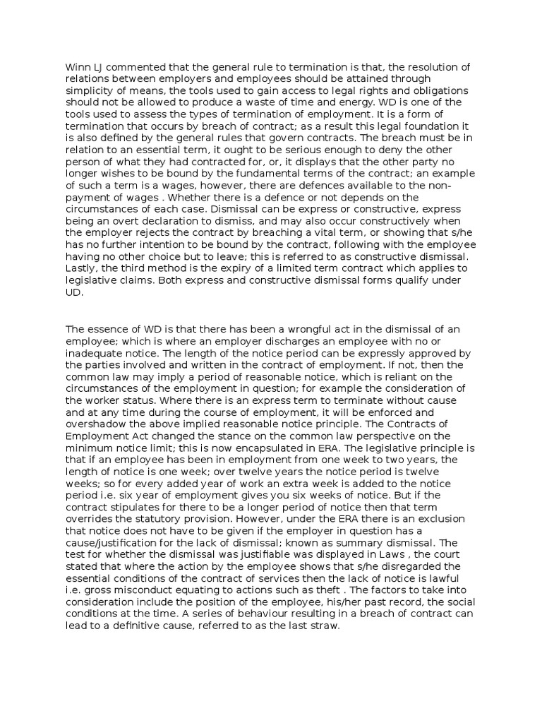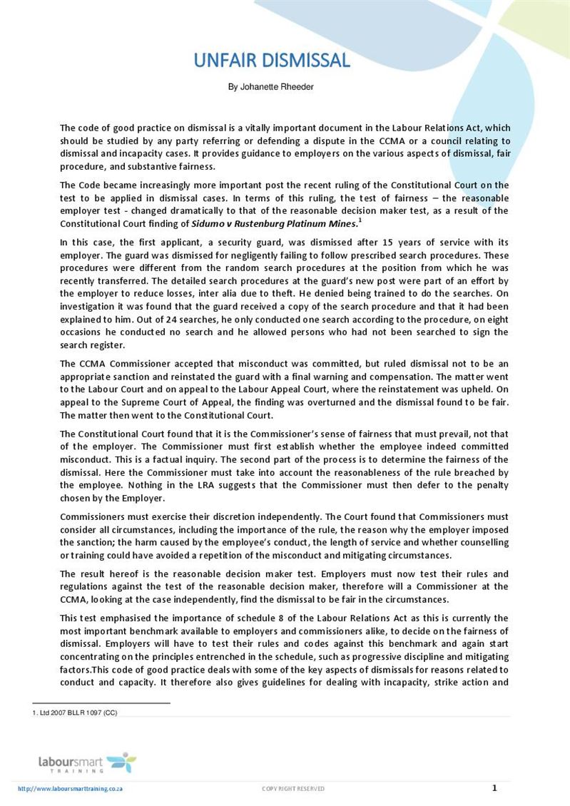 The contribution aims to identify the possible existing relations between the established case law and the latest regulatory amendments enacted in the field of the disabled worker‟s dismissal. The fair work commission (the commission) decides on cases of unfair dismissal. If you think you have been unfairly dismissed you need to contact the commission as soon as possible. Is being dismissed for not disclosing your personal relationships unfair? In 2016 alone, 1,226 out of the 1,340 cases brought to the court were related to unfair dismissals, with about rm21,841,008 awarded against firms. If a tribunal finds that an employee has been unfairly dismissed, you might be ordered to there's a limit on the amount a tribunal can award for unfair dismissal, apart from in cases relating to: Unfair dismissal the claim for unfair dismissal will be handled by the industrial court. The industrial court has ruled in favour of malaysia airlines bhd in an unfair dismissal case filed by a flight supervisor who. The right to file a representation under the industrial relations act is available to all employees in malaysia and is not limited to malaysian citizens. Here are a few things about unfair does the employer need to show the reason of dismissal or he could terminate the contract as long as in case of any discrepancies, the original language in english will prevail. In lieu of the above, cases that contribute to the development of this employment law area will be examined. Unfair dismissal is where your employer has dismissed you without due cause, a fair reason or has breached one of the necessary criteria [detailed in following yes, if you have been dismissed from your employment you may bring a case of unfair dismissal provided certain conditions have been met. Suffered by the dismissed employee as a result of the dismissal in cases where it was held that that compensation for dismissal is limited to compensation for financial loss and excludes punitive damages.25.